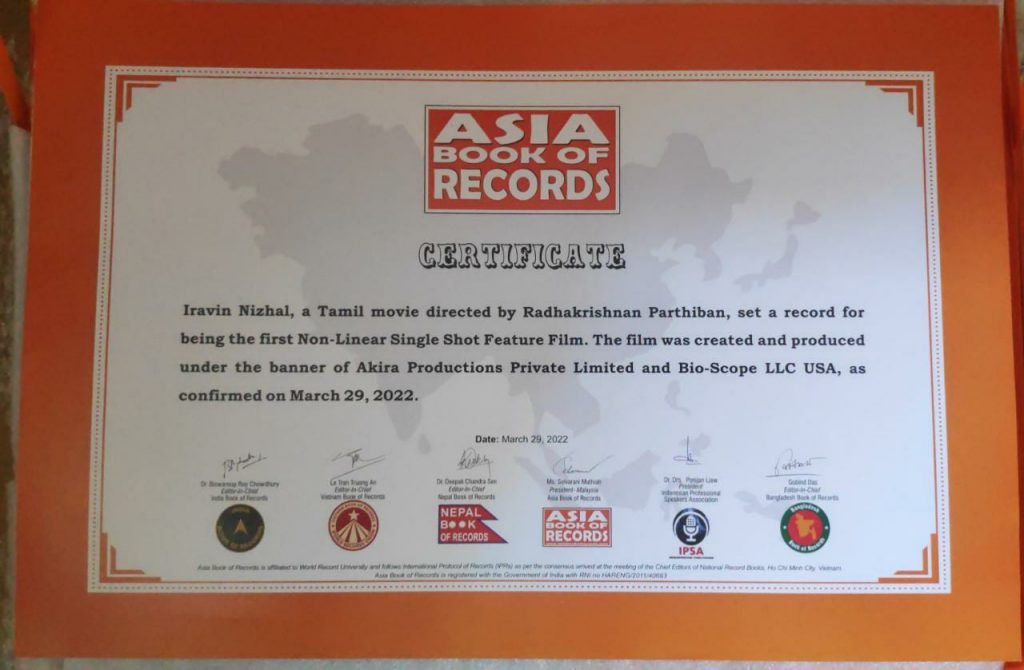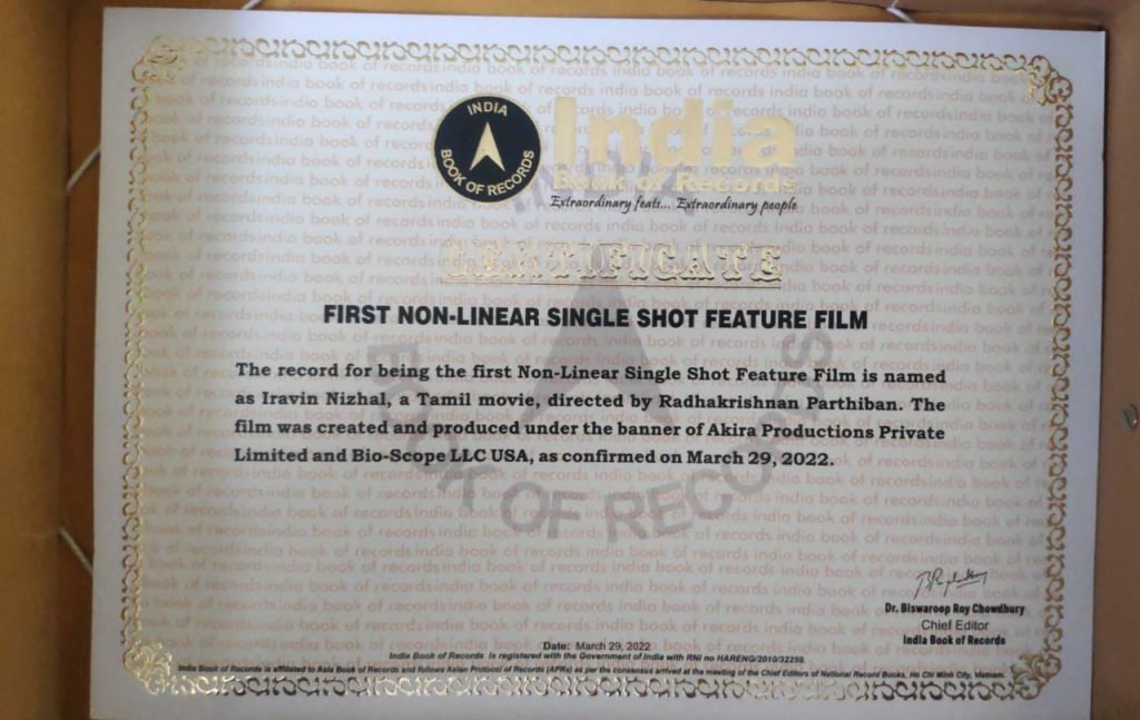ஆர் பார்த்திபனின் இரவின் நிழல் படத்தை முதல் நான்-லீனியர் சிங்கிள் ஷாட் திரைப்படமாக ஏசியன் புக் ஆஃப் ரெக்கார்ட்ஸ் மற்றும் இந்தியா புக் ஆஃப் ரெக்கார்ட்ஸ் அங்கீகரித்துள்ளன