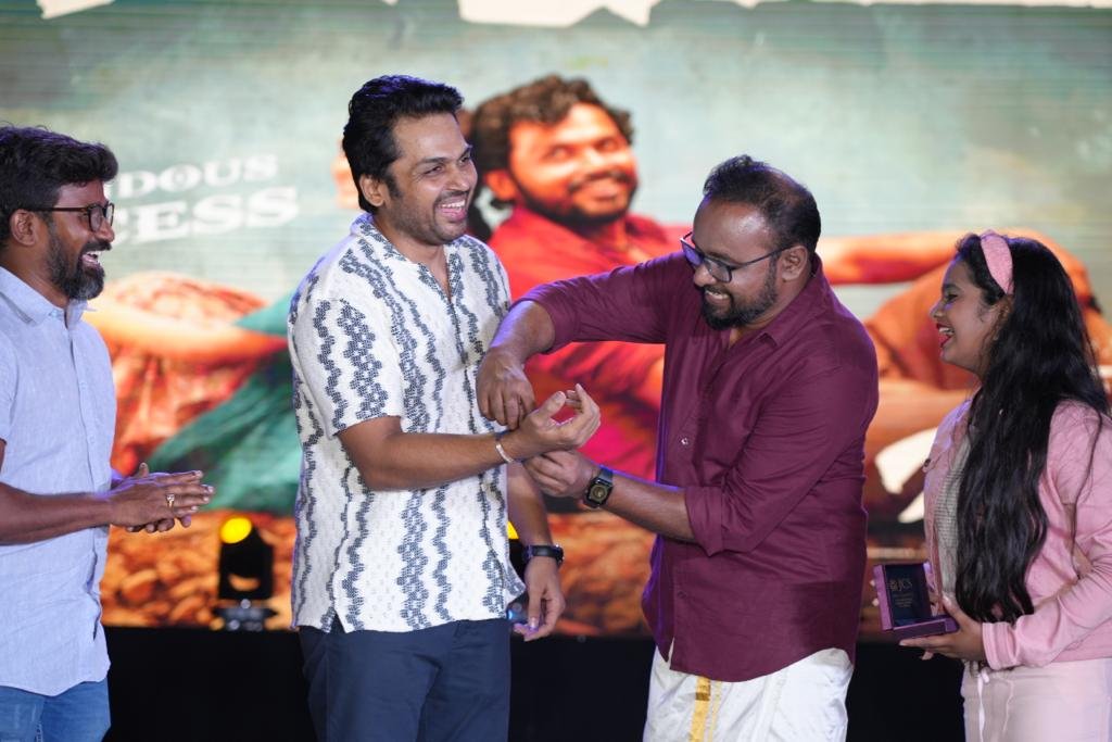 கார்த்தி நடிப்பில் வெளியான ‘விருமன்’ விமர்சன ரீதியாகவும், வசூல் ரீதியாகவும் புதிய சாதனை படைத்து வருகிறது. இதனால் படத்தை வெளியிட்ட விநியோகஸ்தர் சக்திவேலன், படத்தின் நாயகன் கார்த்தி, படத்தின் தயாரிப்பாளர் சூர்யா, படத்தின் இணை தயாரிப்பாளர் ராஜசேகர் பாண்டியன் ஆகியோருக்கு வைரத்தினாலான காப்பை பரிசாக வழங்கி மகிழ்ந்தார். அத்துடன் ‘விருமன்’ படத்தை இயக்கிய இயக்குநர் முத்தையாவிற்கு வைர மோதிரத்தை பரிசளித்து கௌரவித்தார்.