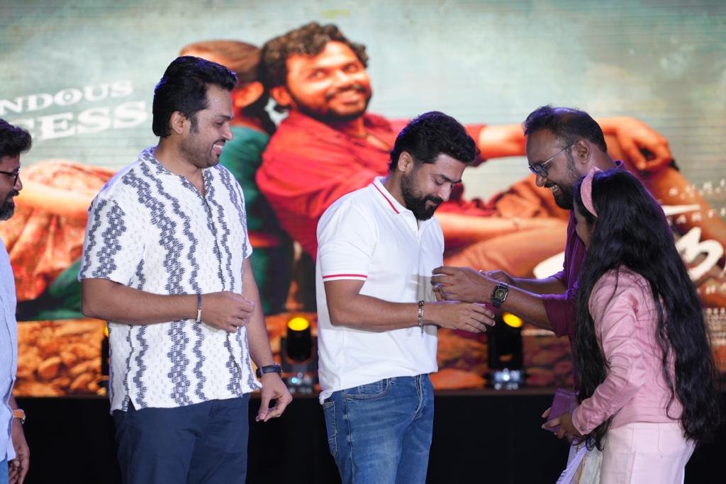 ‘விருமன்’ படம் வெளியான ஐந்து நாட்களில் உலக அளவில் 40 கோடி ரூபாய்க்கு மேல் வசூலித்து, வசூல் சாதனை படைத்து வருகிறது. இதனை கொண்டாடும் வகையில் நேற்று சென்னையில் வெற்றி விழா நடைபெற்றது. இதில் கலந்துகொண்ட படத்தின் தயாரிப்பாளரான நடிகர் சூர்யாவிற்கும், இணை தயாரிப்பாளர் ராஜசேகர் பாண்டியனுக்கும், படத்தின் நாயகனான கார்த்திக்கும் படத்தை தமிழகம் முழுவதும் வெளியிட்டிருக்கும் சக்தி ஃபிலிம் ஃபேக்டரி சக்திவேலன் வைரக்காப்பினை பரிசாக அளித்தார். இந்த படத்தின் இயக்குநரான முத்தையாவிற்கும் வைர மோதிரத்தை பரிசளித்து உற்சாகப்படுத்தினார்.