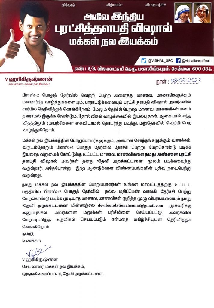 பிளஸ்+2 பொதுத் தேர்வில் வெற்றி பெற்ற அனைத்து மாணவ, மாணவிகளுக்கும் மனமார்ந்த வாழ்த்துக்களையும், பாராட்டுக்களையும் புரட்சி தளபதி விஷால் அவர்களின் சார்பில் தெரிவித்துக் கொள்கிறோம். மேலும் தேர்ச்சி பெறாத மாணவ, மாணவிகள் மனம் தளராமல் இருக்க வேண்டும். தோல்விகள் வாழ்க்கையில் இயல்பு தான். ஆகையால் எந்த விதத்திலும் முயற்சிகளை கைவிடாமல் தொடர்ந்து படித்து, மறுதேர்வில் வெற்றி பெற வாழ்த்துகிறோம்.