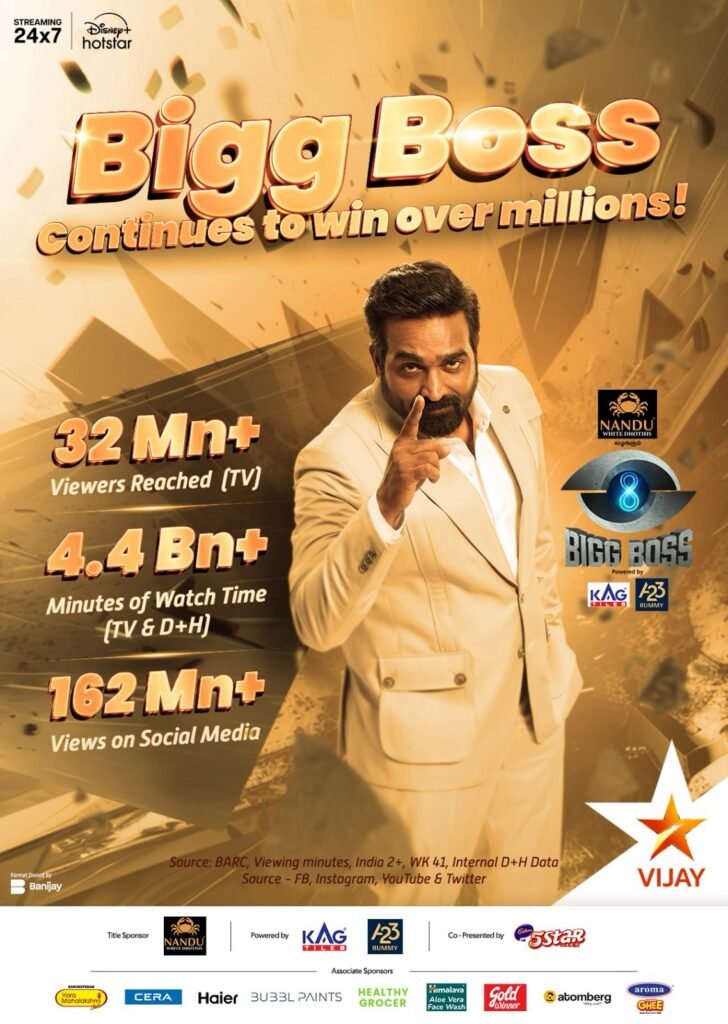 • முதல் வாரத்தில் 32 Mn+ பார்வையாளர்கள் தொலைக்காட்சியில் நிகழ்ச்சியை பார்த்தனர்.