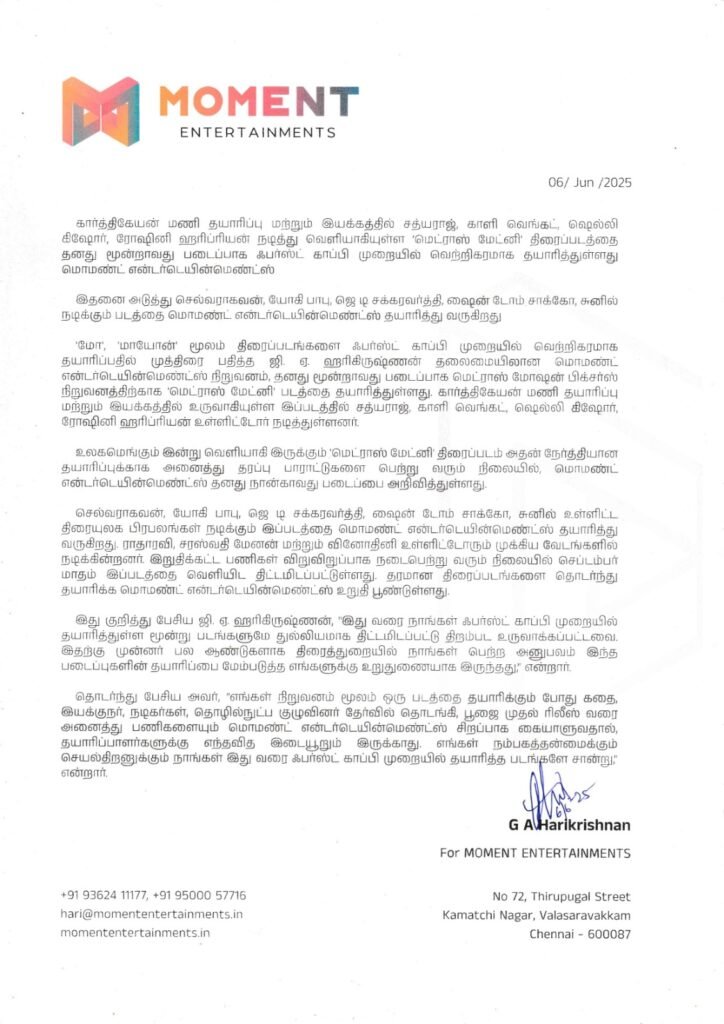 ‘மோ’, ‘மாயோன்’ மூலம் திரைப்படங்களை ஃபர்ஸ்ட் காப்பி முறையில் வெற்றிகரமாக தயாரிப்பதில் முத்திரை பதித்த ஜி. ஏ. ஹரிகிருஷ்ணன் தலைமையிலான மொமண்ட் என்டர்டெயின்மெண்ட்ஸ் நிறுவனம், தனது மூன்றாவது படைப்பாக மெட்ராஸ் மோஷன் பிக்சர்ஸ் நிறுவனத்திற்காக ‘மெட்ராஸ் மேட்னி’ படத்தை தயாரித்துள்ளது. கார்த்திகேயன் மணி தயாரிப்பு மற்றும் இயக்கத்தில் உருவாகியுள்ள இப்படத்தில் சத்யராஜ், காளி வெங்கட், ஷெல்லி கிஷோர், ரோஷினி ஹரிப்ரியன் உள்ளிட்டோர் நடித்துள்ளனர்.