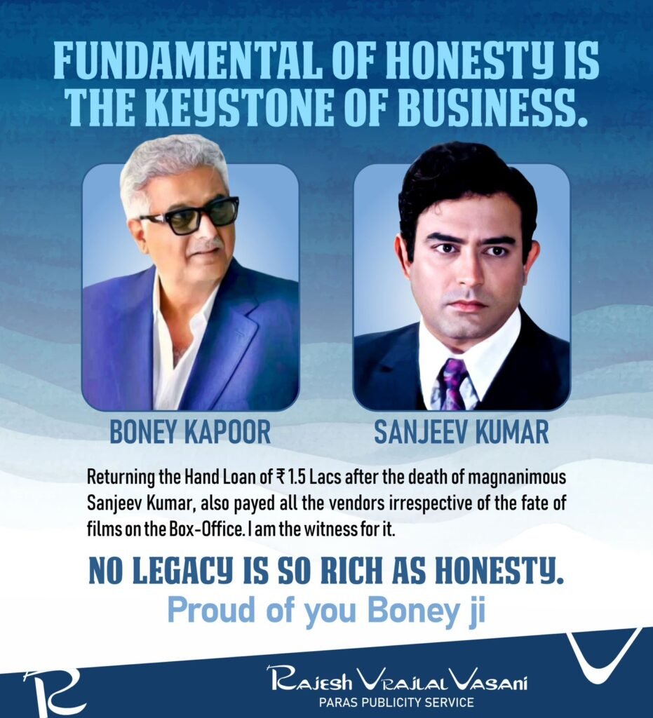 திரைத்துறையின் மூத்த நிபுணரும், Paras Publicity Service நிறுவனத்தின் உரிமையாளருமான ராஜேஷ் வ்ரஜ்லால் வசானி, சமீபத்தில் போனி கபூர் தனது நிறுவனத்தின் விற்பனையாளர், தொழில்நுட்பக் குழுவினர், மற்றும் இணைபணியாளர்களுக்கு படத்தின் வணிக வெற்றியோ, தோல்வியோ பொருட்படுத்தாமல், முழு தொகையையும் செலுத்தி வந்த வரலாற்றைப் பாராட்டினார். இந்த நடைமுறை, Koi Mere Dil Se Poochhe, Shakti போன்ற பழைய படங்களில் இருந்து Mili (2022), Maidaan (2024) போன்ற சமீபத்திய தயாரிப்புகளிலும் தொடர்ந்துள்ளதை கவனித்து அங்கீகரித்தார் ராஜேஷ் வ்ரஜ்லால் வசானி.