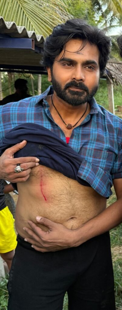 நிலைதடுமாறி கீழே விழுந்த அவருக்கு வயற்றுலிருந்து மார்பு வரை ஒரு கோடு காயமாக ஏற்பட்டது. இதனால் அந்தப் படப்பிடிப்பிலிருந்து உடனடியாக ஆஸ்பத்திரிக்கு அழைத்து சென்றனர், அக்கம் பக்கத்தில் உள்ளவர்கள் எல்லாம் கூடியது மே ஒரே பரபரப்பாகிவிட்டது.