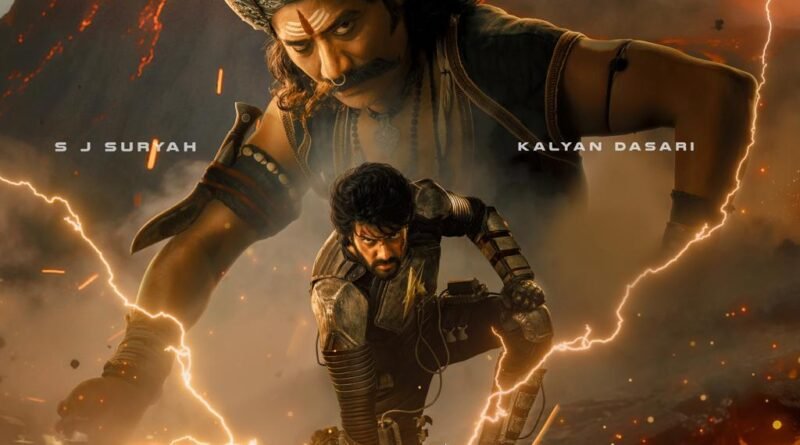 போஸ்டரில் ஒரு மாபெரும் எரிமலை வெடித்து, தீக்கங்குகளை வெளிப்படுத்துகிறது. ஆகாயம் முழுவதும் புகை மற்றும் சாம்பலால் மூடப்படுகிறது. அந்தக் குழப்பத்திலிருந்து, எஸ்.ஜே.சூர்யா, காளை போன்ற கொம்புகளுடன், பழங்குடி போர்வீரர் தோற்றத்தில், கொடூரமான அசுரனாக எழுகிறார். அவருக்கு முன், கல்யாண் தாசரி சூப்பர் ஹீரோ வேடத்தில், நவீன போர்க்கவசம் அணிந்து, தன்னம்பிக்கையுடன் மண்டியிட்டு எழுந்து நிற்கிறார். இந்த காட்சி, ஒரு அபாரமான ஹீரோ–வில்லன் மோதலை வெளிப்படுத்துவதாக அமைந்துள்ளது.