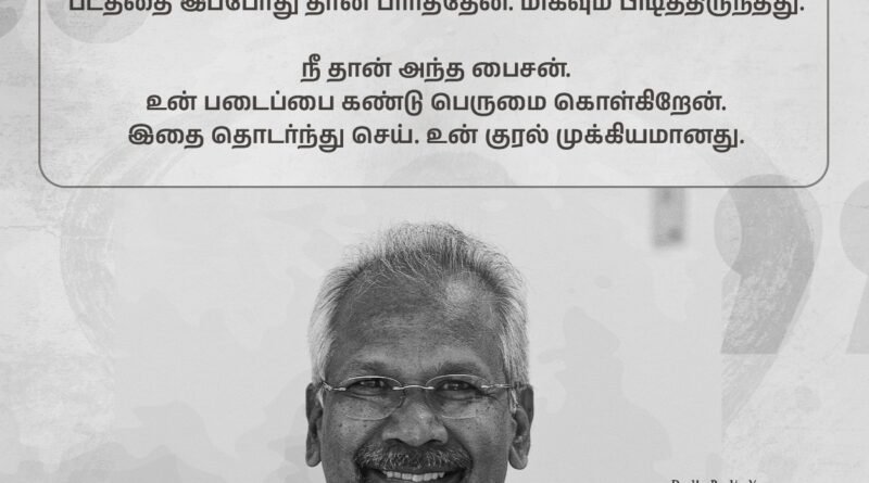 “மாரி படத்தை இப்போதுதான் பார்த்தேன் மிகவும் பிடித்திருந்தது. நீதான் அந்த பைசன், உன் படைப்பை கண்டு பெருமை கொள்கிறேன், இதை தொடர்ந்துசெய், உன் குரல் முக்கியமானது”
