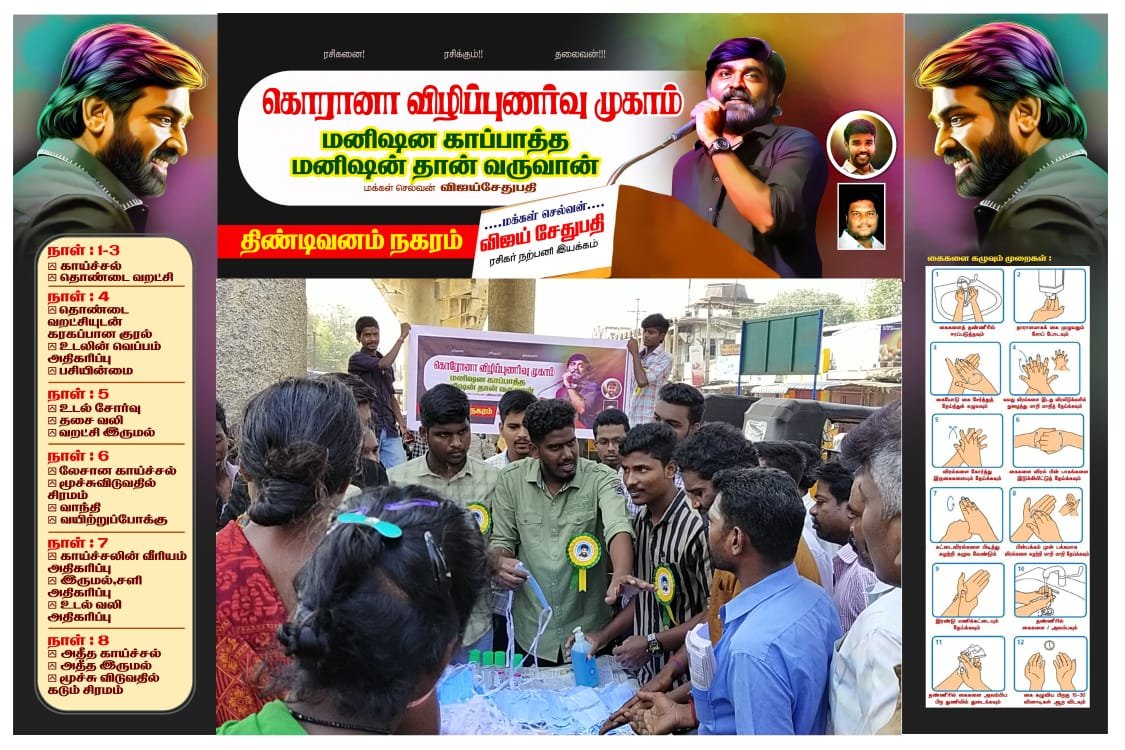 இந்நிலையில், விழுப்புரம் மாவட்டம் திண்டிவனத்தில் பேருந்து நிலையத்தில் விஜய் சேதுபதி ரசிகர் நற்பணி இயக்கம் சார்பில் பொதுமக்களுக்கு கொரோனா பற்றிய விழிப்புணர்வு கொடுக்கப்பட்டது.