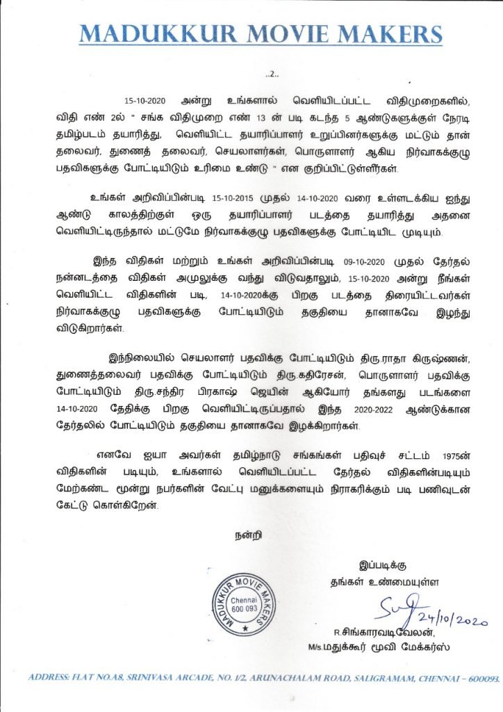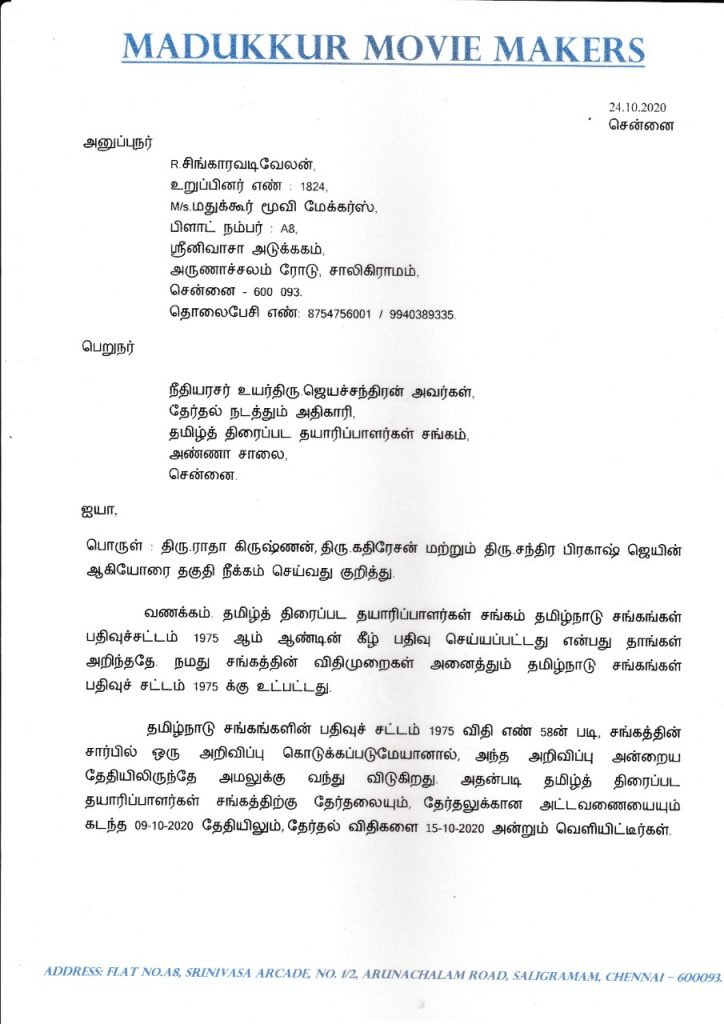 துணை தலைவர் பொறுப்புக்கு போட்டியிடும் கதிரேசன், கௌரவ செயலாளர் பொறுப்புக்கு போட்டியிடும் ராதாகிருஷ்ணன் பொருளாளர் பொறுப்புக்கு போட்டியிடும் சந்திரபிரகாஷ் ஜெயின் ஆகியோருடைய வேட்புமனுக்களை தள்ளுபடி செய்ய வேண்டும் என தேர்தல் அதிகாரியிடம் புகார் செய்துள்ளார் அது சம்பந்தமான கடிதம் இத்துடன் இணைக்கப்பட்டுள்ளது